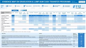 This interactive map organises more than 100 studies on Graduation programmes, their component parts, and some lump-sum cash transfer programmes, from Asia, Africa, and the Americas, making it easy to discover what works, where, and for whom. The evidence map presents a clear matrix of programme components (e.g., asset transfers, cash grants, training, and coaching) and the outcomes they affect (e.g., income, food security, health, education, and more). For further details on how the map has been developed and its contents, including definitions of interventions/components studied and outcomes, please see the brief narrative report.
